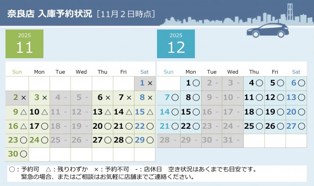 - 11月・12月奈良店のサービス入庫予約状況のお知らせ