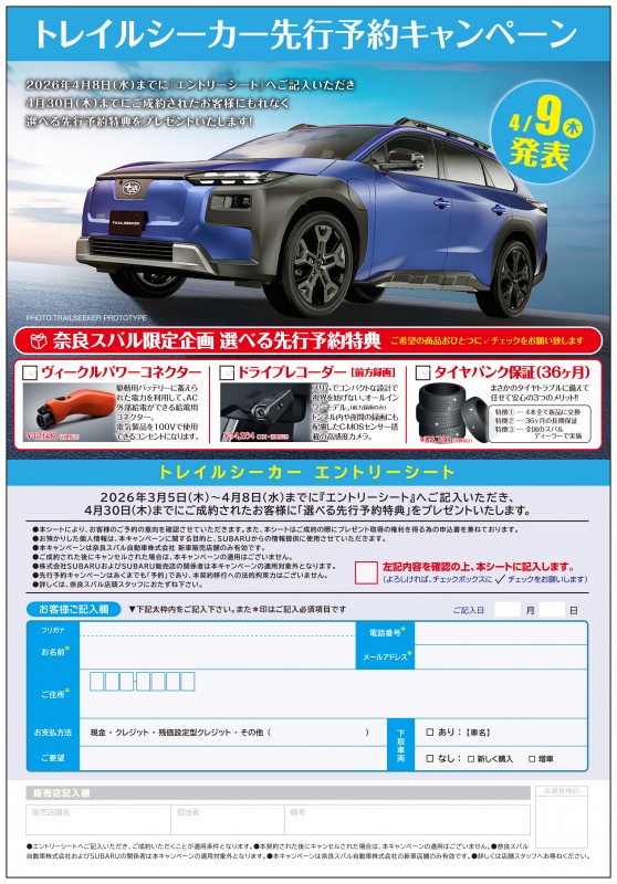 また、4月8日までに店頭でエントリーシートをご記入いただき、ご成約いただいた方には奈良スバルからの成約プレゼントも計画しております。詳しくはスタッフまで!