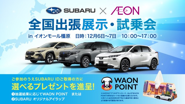 12月6日~7日の2日間、橿原店の近くのイオンモール橿原でSUBARU×AEONの出張展示会を開催いたします。